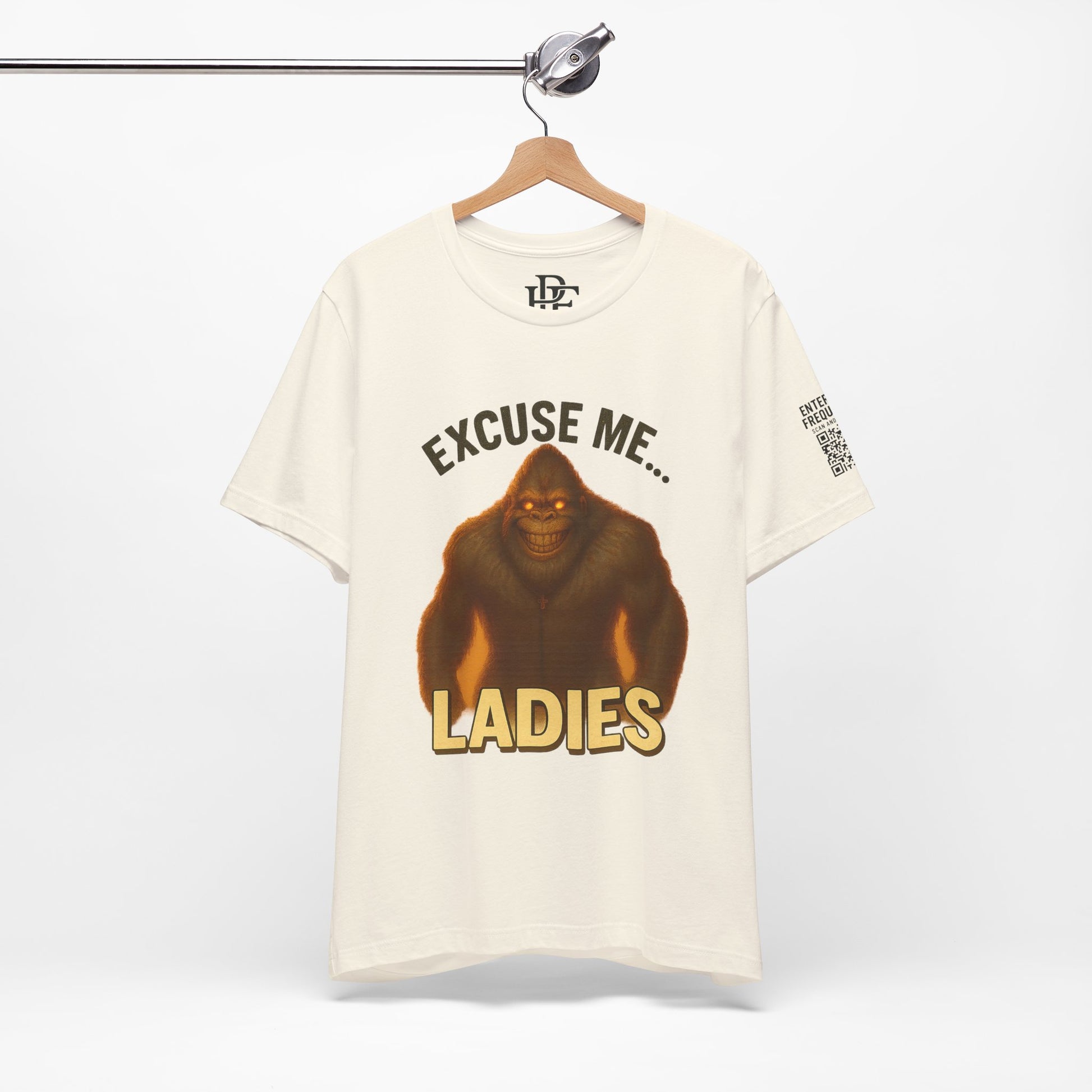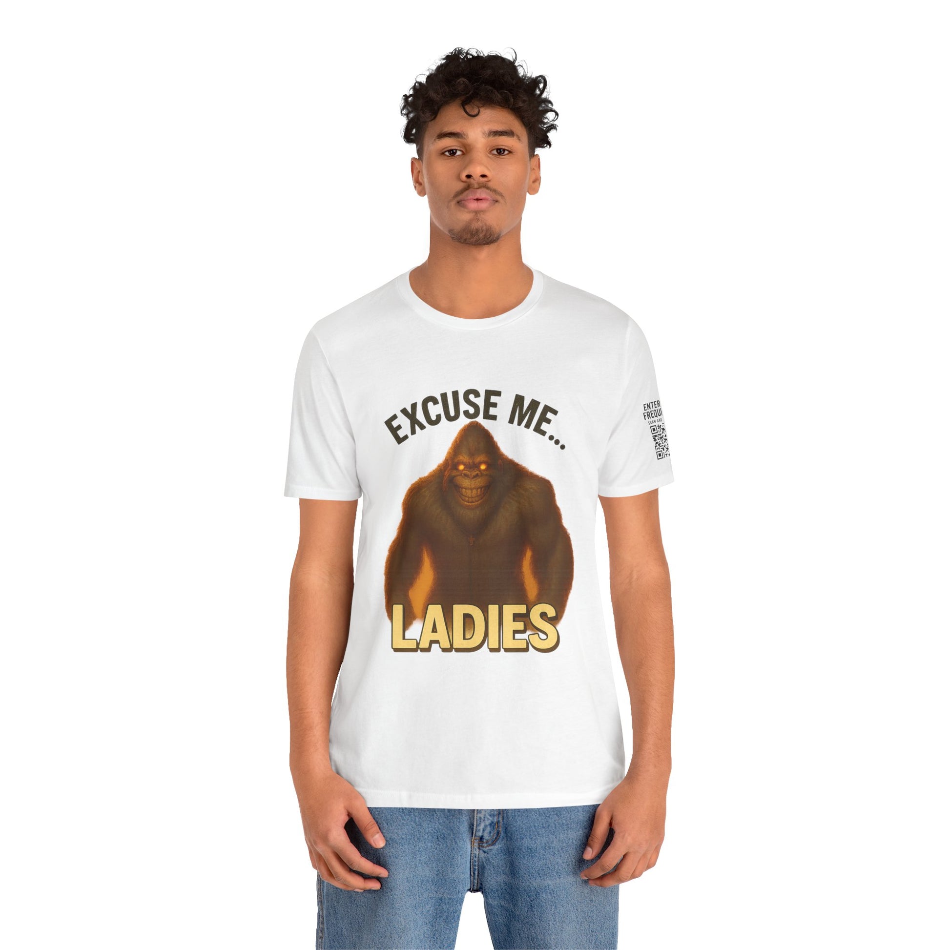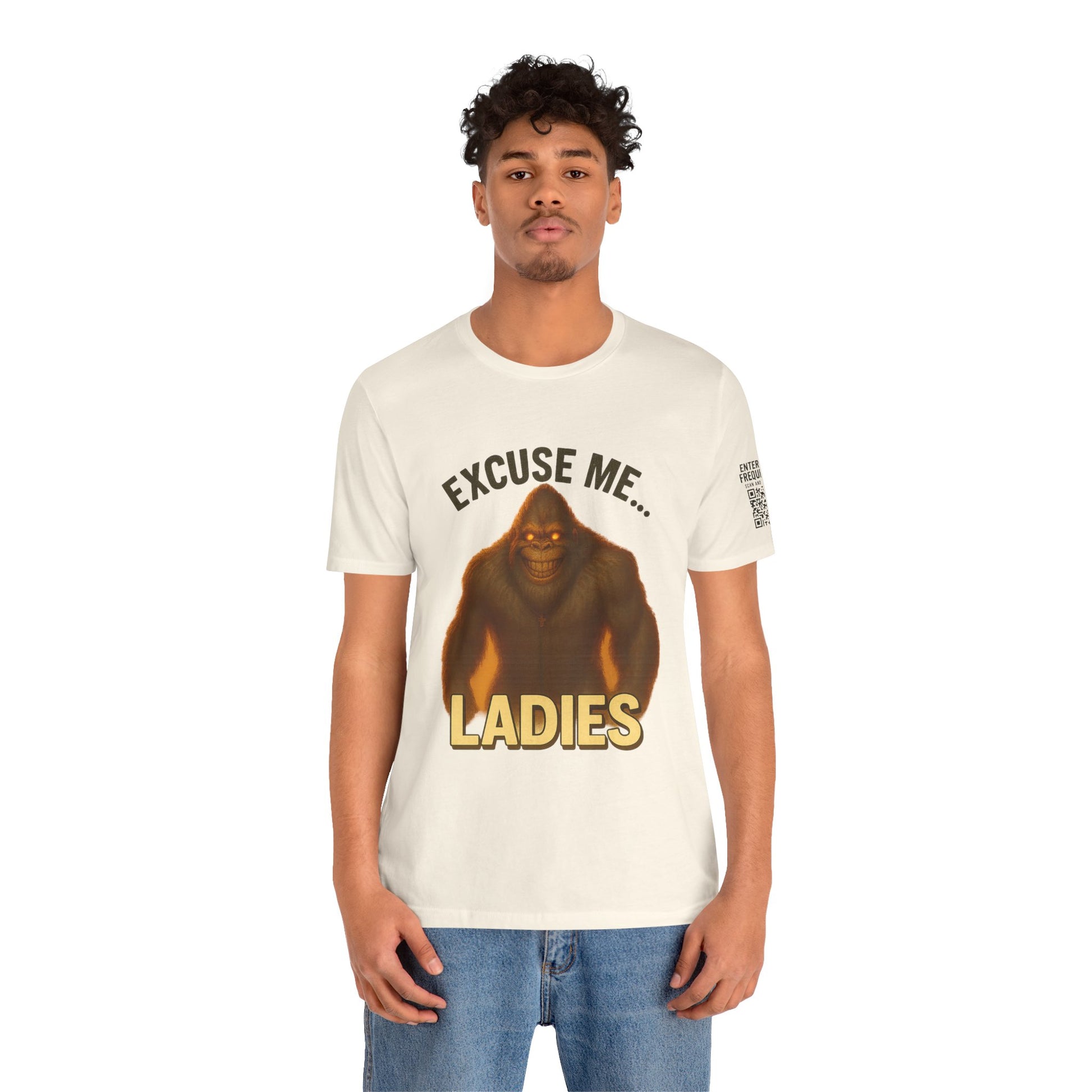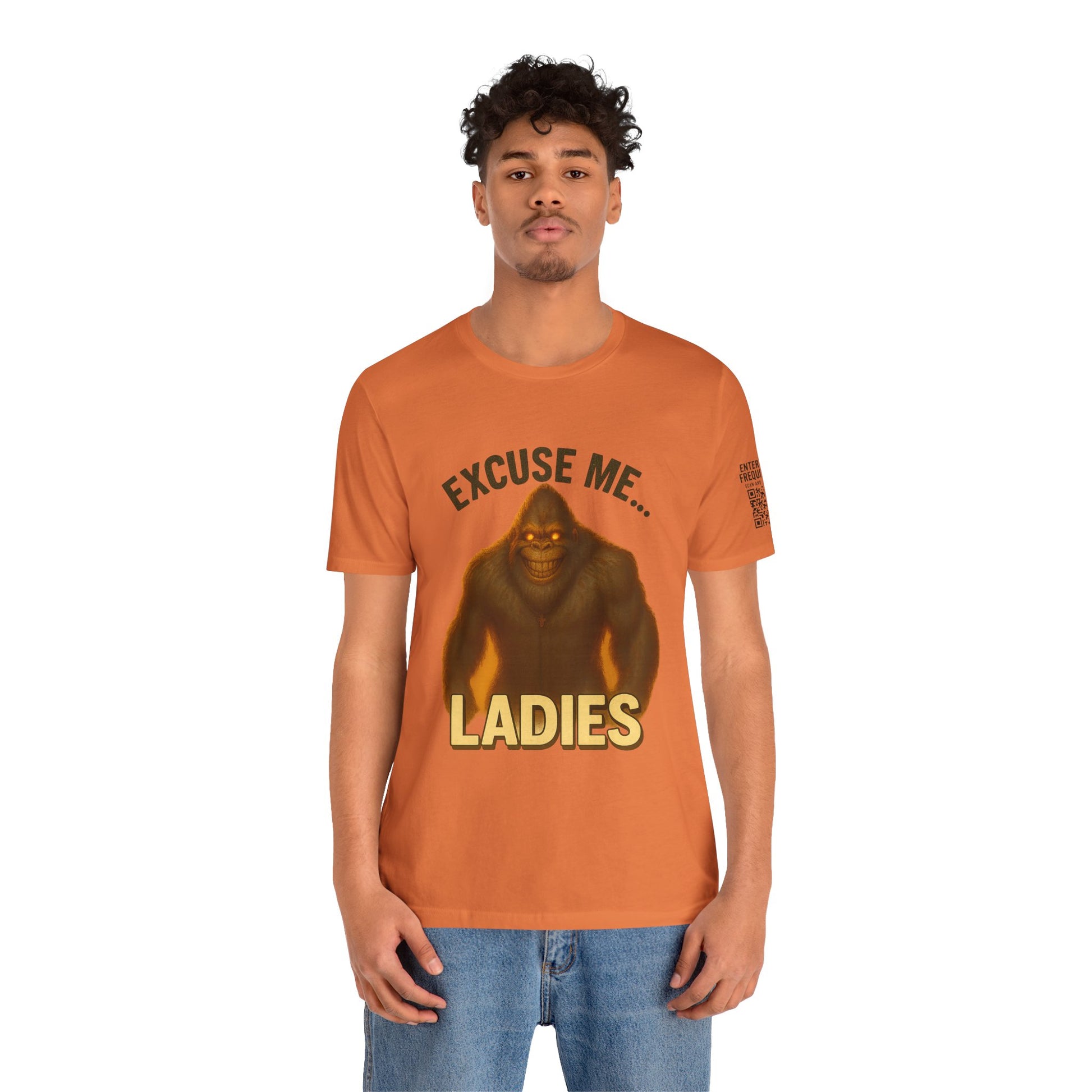 Funny Bigfoot T-Shirt – Excuse Me Ladies | Unisex Jersey Tee, Cryptid Humor Shirt, Outdoor Lover Gift